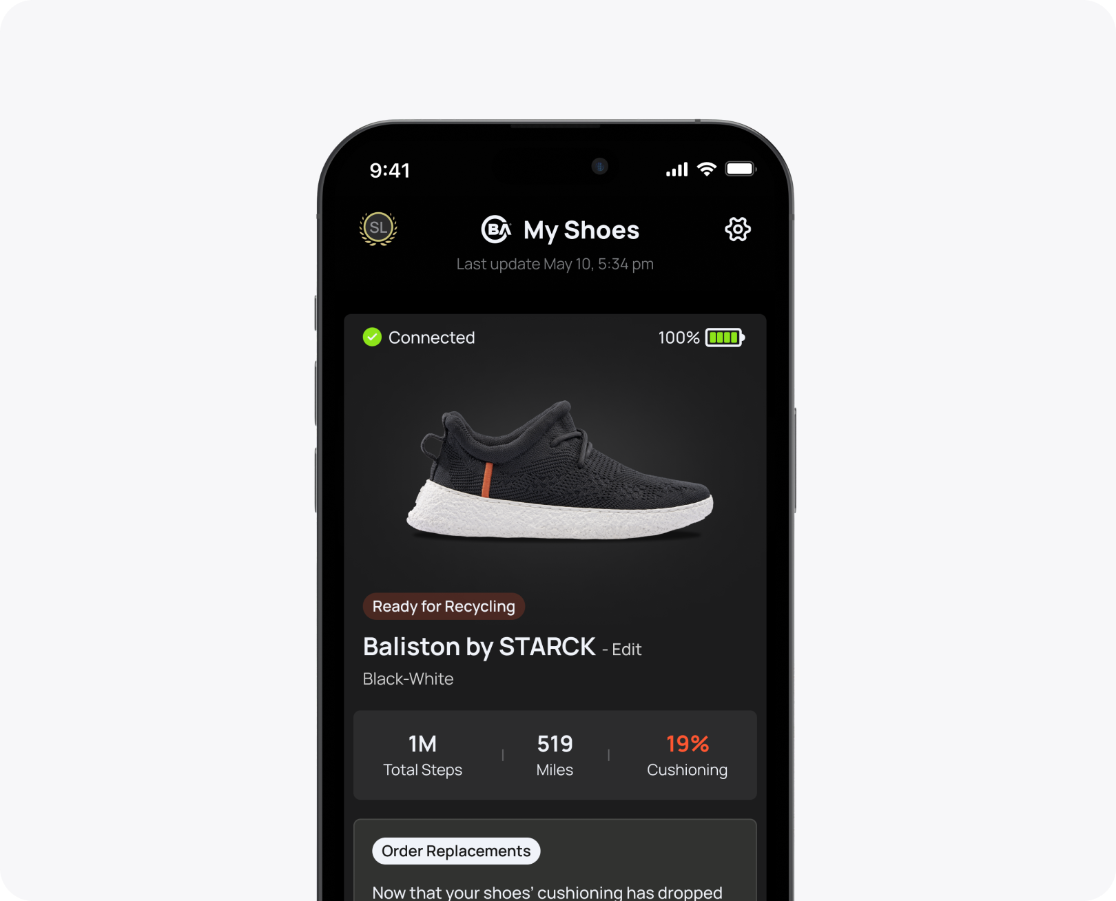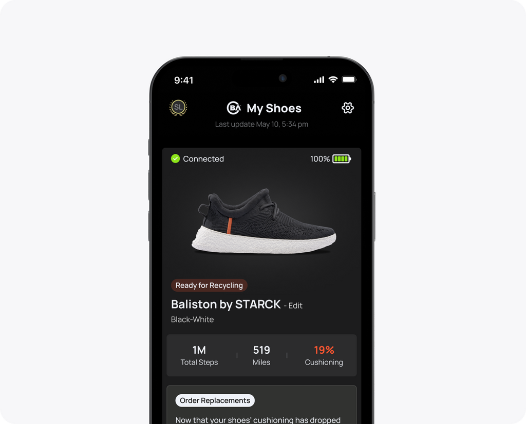 While some companies admirably use recycled materials, we don't stop there. We believe our impact on the planet goes until the end of life of our products. Our shoes are made from just five bio-based recyclable materials and designed to monitor the deterioration of their own cushioning, allowing Baliston to collect and recycle every single pair produced.